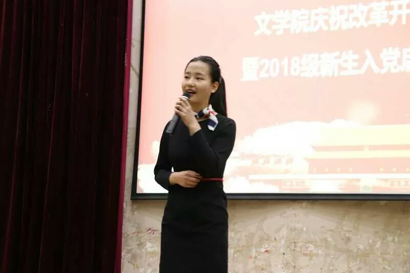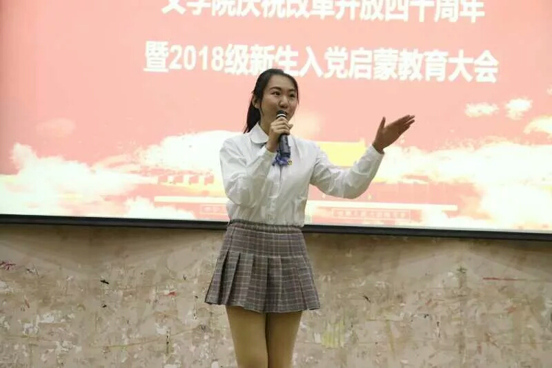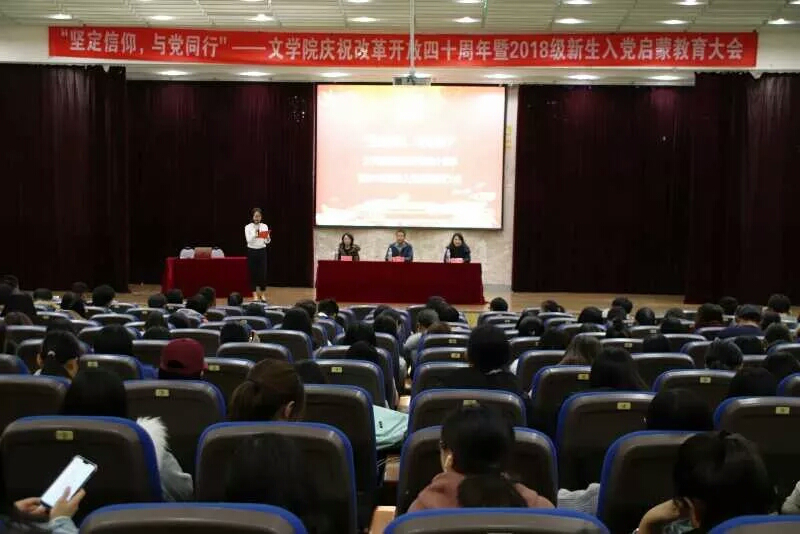 12月20日下午,“坚定信仰,与党同行” ——文学院庆祝改革开放四十周年暨2018级新生入党启蒙教育大会在金家岭校区图文中心四楼报告厅举行。文公司党委副书记张辉、团委书记曹珺、员工工作党支部书记李晨曦及2018级新生共同参会。