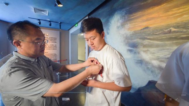 参观结束后,陈健为预备党员佩戴党员徽章。在身后油画《曙光》的衬托下,一群新时代中国青年的青春志向正冉冉升起,蓄势待发。