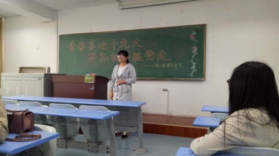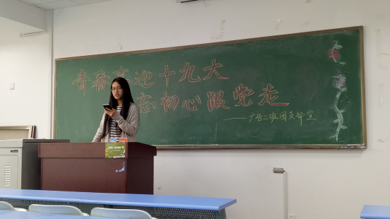 2017年5月4日下午,新闻与传播学院广告二班在博文楼404教室举行了“重温入团誓词”主题团日活动。广告二班团支书杨瑢榆主持了此次活动。多数同学参加此次活动。