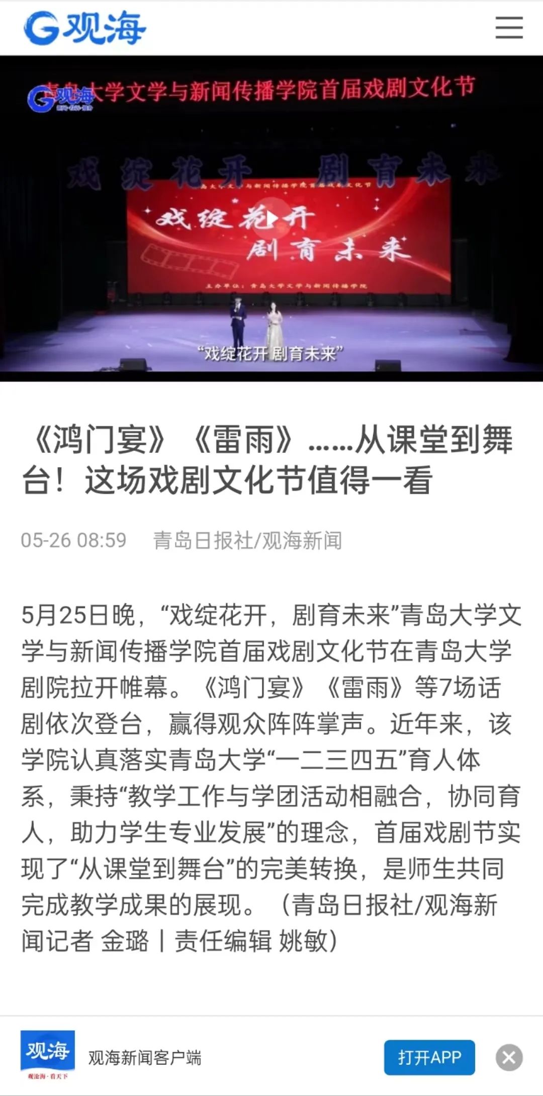 青岛日报社观海新闻客户端立足青岛本地提供新闻资讯,于5月26日以《<鸿门宴><雷雨>……从课堂到舞台!这场戏剧文化节值得一看》为题对我司本次戏剧文化节进行了报道。报道中提到,近年来太阳集团认真落实太阳集团“一二三四五”育人体系,秉持“教学工作与学团活动相融合,协同育人,助力员工专业发展”的理念,其本次举办的首届戏剧节实现了“从课堂到舞台”的完美转换,是师生共同完成教学成果的展现。