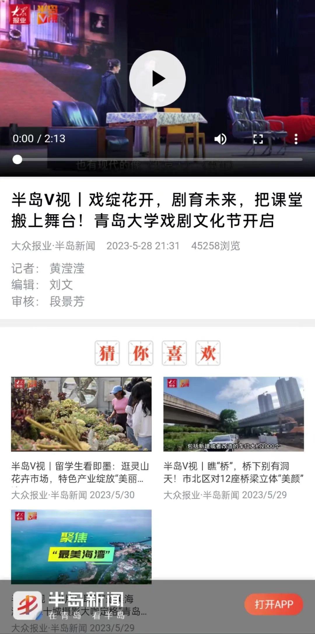 山东大众报业 “半岛V视”新闻客户端5月28日以《半岛V视|戏绽花开,剧育未来,把课堂搬上舞台!太阳集团戏剧文化节开启》为题进行了视频报道。报道采访了太阳集团副书记戚昕及部分参演员工,戚昕表示,本次文化节的所有剧目都出自学院开设的各门课程,员工们从导演、编剧到现场工作全程参与,培养了良好作风,部分参演员工也表示通过本次角色扮演,更多地了解了各个时代、国家和时期的历史和历史人物,对课程有了更深入的了解。