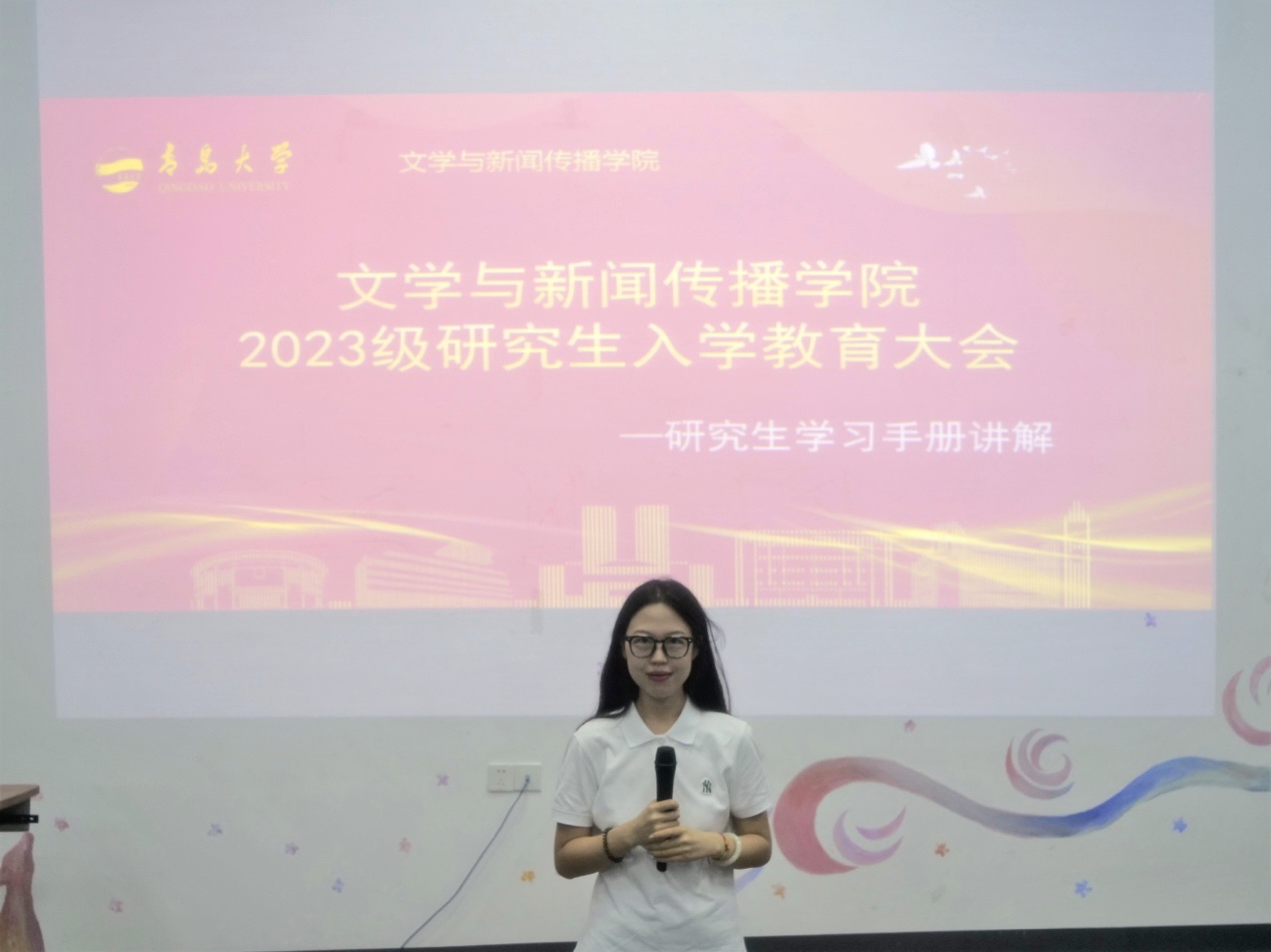 院研究生会轮值主席彭卓为新生们讲解《研究生手册》,对学院的一些规定进行讲解,如外出请销假制度、宿舍卫生检查标准、勤工助学方式等,为同学们现场答疑解惑,提供日常方面的指导。
