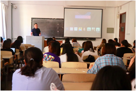 青岛视觉志文化传媒有限公司总裁冯建波在新传做讲座 摄影:吕晓彤