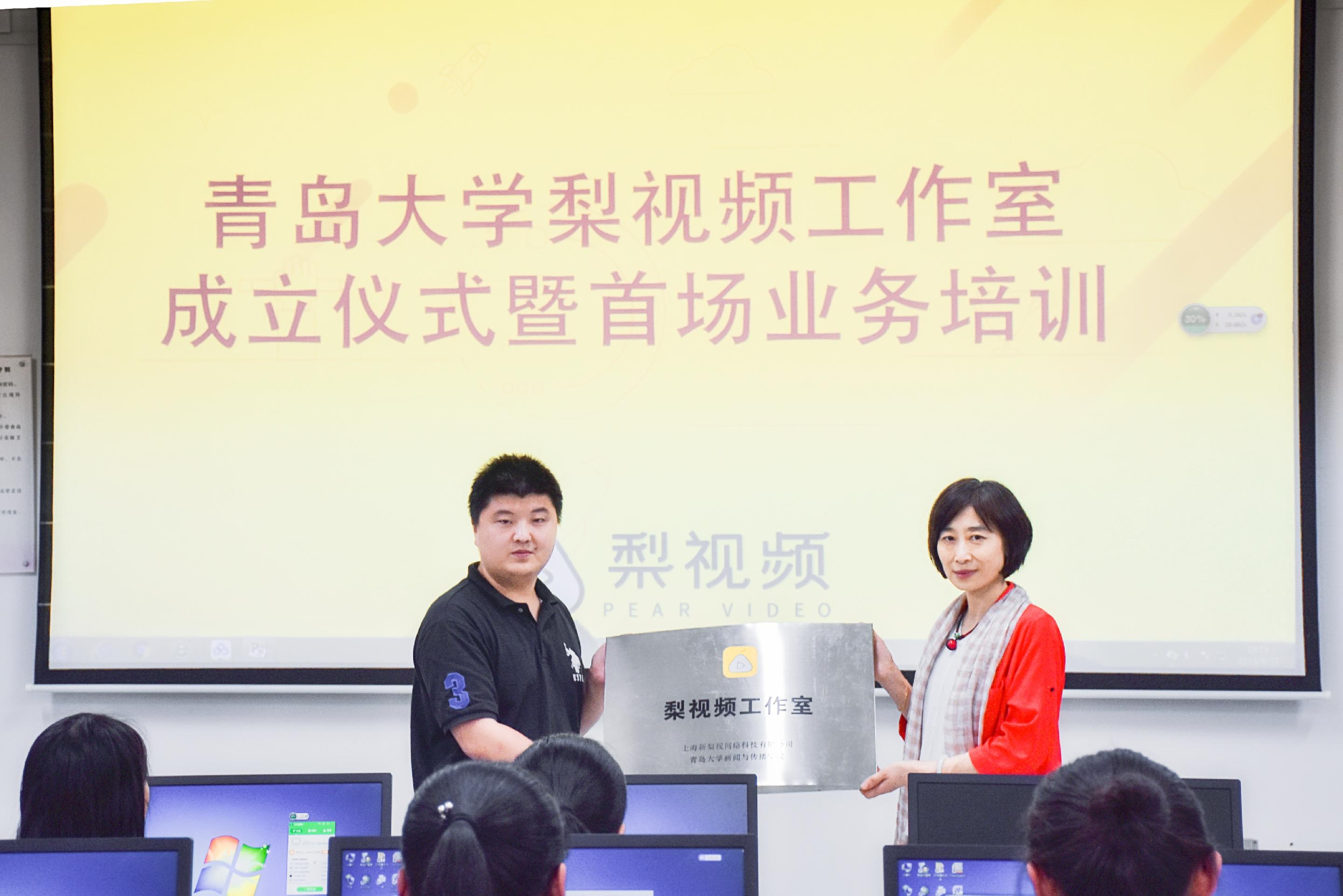 图一:新闻与传播学院经理赵秀凤和梨视频青岛频道主编周超为工作室揭牌