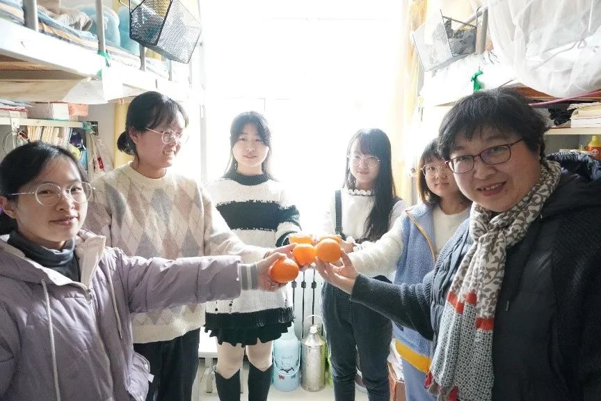 在关心员工们的生活之余,戚昕就其当前的学习进度和规划提供了相应的指导,她建议同学们树立明确的努力方向,注重学习的综合性,并鼓励同学们全力以赴、稳定心态,争取一战成硕。最后,戚昕将橙子分发给同学们,寓意心想事成,以此来祝福同学们都能如愿以偿,成功上岸。