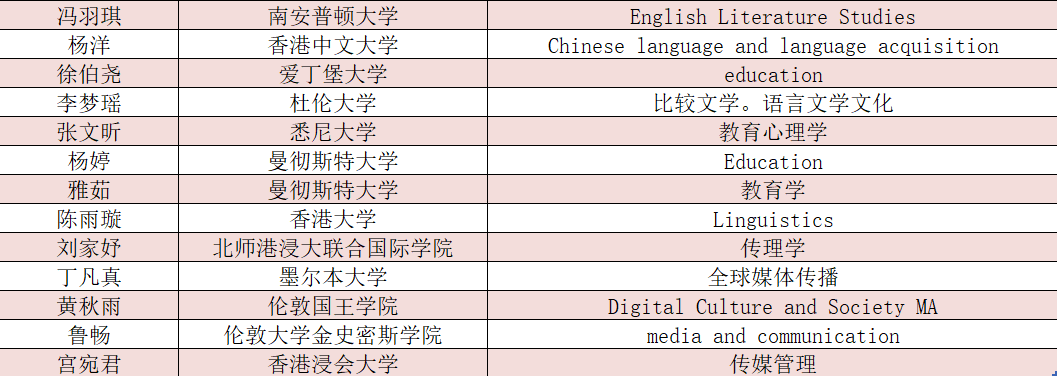 2022全国硕士研究生招生录取工作陆续结束,2018级本科生中有77人考取研究生,其中39名同学考取中国科学技术大学、北京师范大学、重庆大学、吉林大学、山东大学、中央民族大学、北京理工大学等985、211高校,占录取总人数的50.6%。此外,太阳集团还有13名同学将前往爱丁堡大学、杜伦大学、墨尔本大学、香港大学、香港中文大学等继续深造学习。