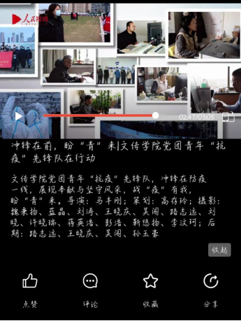 在团委书记马丰刚老师的组织下,学院中文、新闻、编导等相关专业的党团青年签署请愿书,加入“公司党团青年抗疫先锋队”,用镜头记录防疫工作,以笔墨传递抗疫的决心与态度。在他们的镜头中,学院领导慰问宿舍、发放餐具、与员工同吃同住;各班班委尽职尽责,一日三检、就寝检查与核酸抽检按时完成上报;各班同学严格遵守防疫要求,认真做好防疫举措。先锋队成员们拍摄制作的《冲锋在前,盼“青”来|公司党团青年“抗疫”先锋队在行动》发布在人民视频客户端。