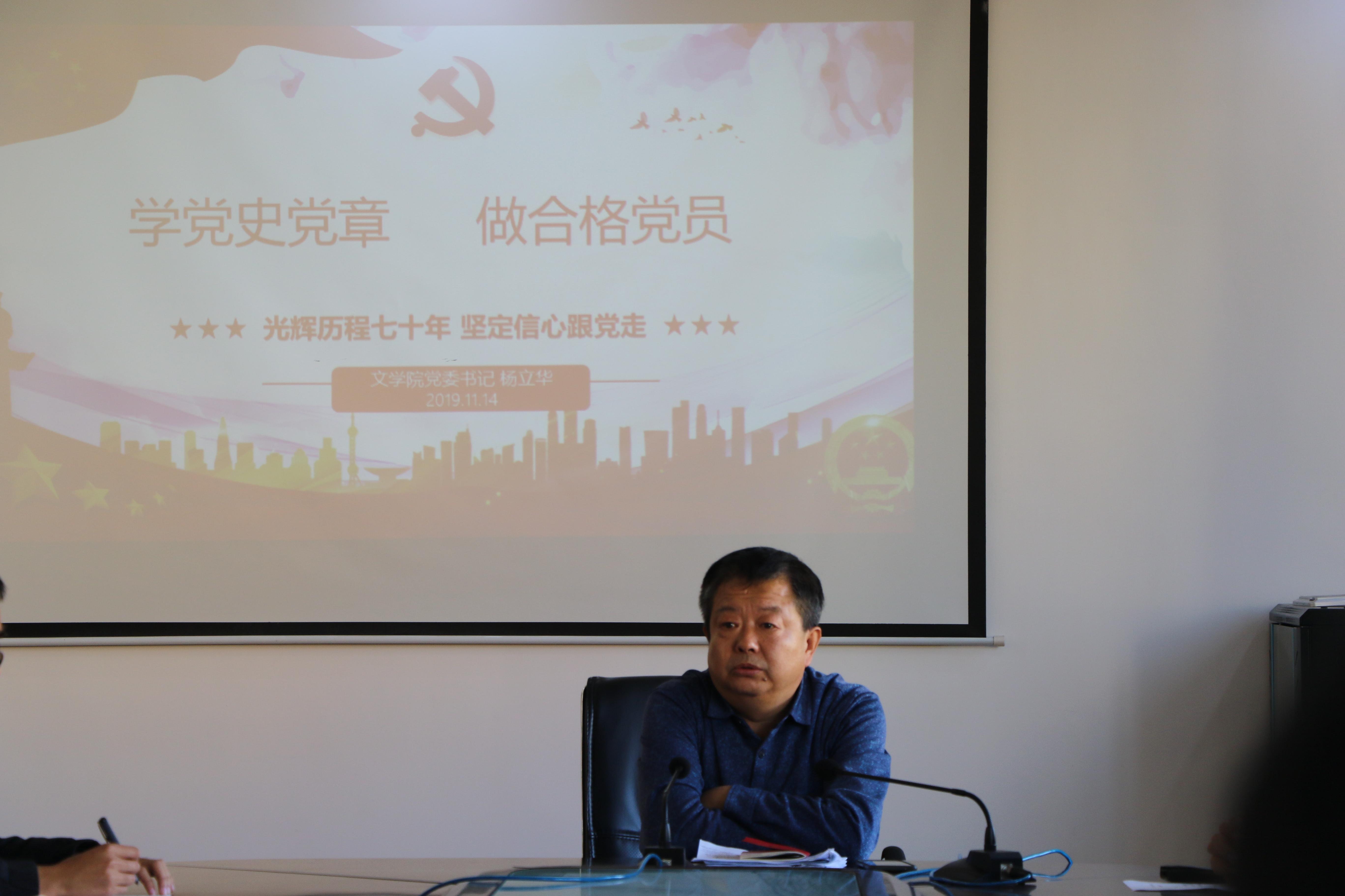 11月14日,文公司党委书记杨立华以“学党史党章,做合格党员——光辉历程七十年,坚定信心跟党走”为题讲专题党课,文学院30余名2019年新发展党员参加党课学习。杨立华首先以新中国成立70周年庆典为切入点,回顾了中华民族在党的领导下所走的从独立到富强的复兴之路。他指出70年的奋斗历程中,个人前途与民族命运是紧密联系的,唯有坚定理想信念,增强“四个自信”,发奋学习,为民族的强大而努力奋斗,才能不负好时代。随后,从中国共产党章程、党员的八条义务等方面讲述如何做一名合格的党员,激励在场的预备党员争做“四讲四有”的合格党员。最后杨立华强调,作为一名党员,应该在工作和生活中,起到模范带头作用,脚踏实地,不忘初心,牢记使命,始终以一名党员的标准要求自己。