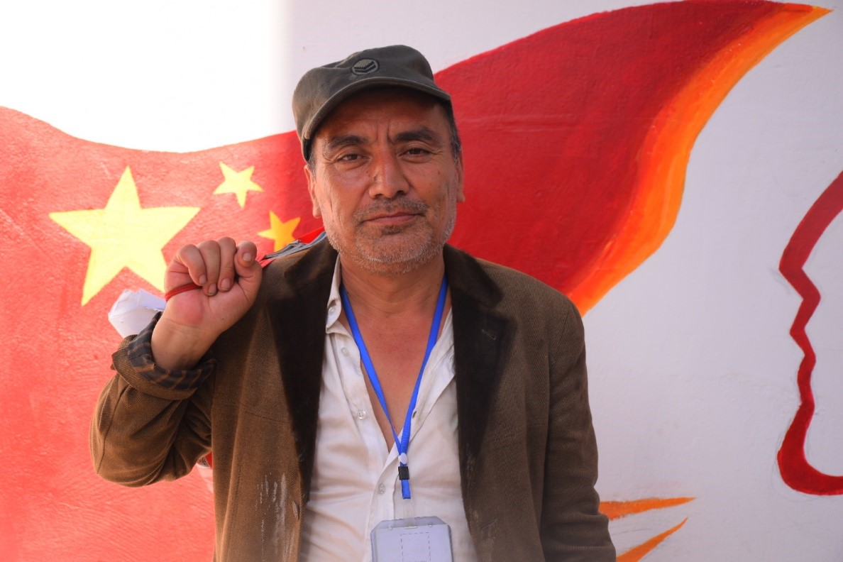 热情洋溢的志愿服务也得到了老乡们真诚的反馈。墙绘期间,一位路过的名叫阿布都卡丁的居民被吸引驻足观看并在墙绘结束后主动请志愿者同学拍照留念。在拍照时,他自豪地站在了墙绘的五星红旗的背景下。参与墙绘的维吾尔族小朋友翻译说阿布都卡丁非常喜欢志愿者们的墙绘,即使语言不通,他还是用“谢谢”这最质朴的语言表达对志愿者的感谢。服务只有起点,满意没有终点。志愿者团队的工作得到了社区居民的喜欢,就是对志愿服务工作的最大认可。