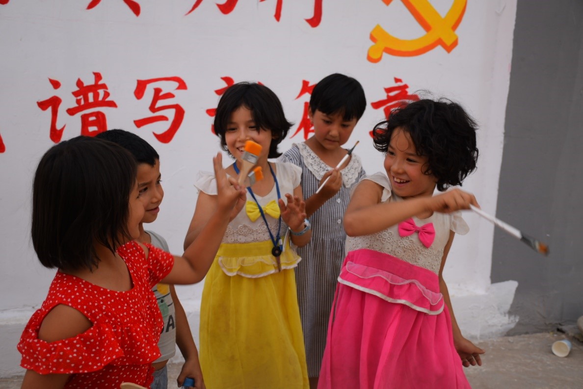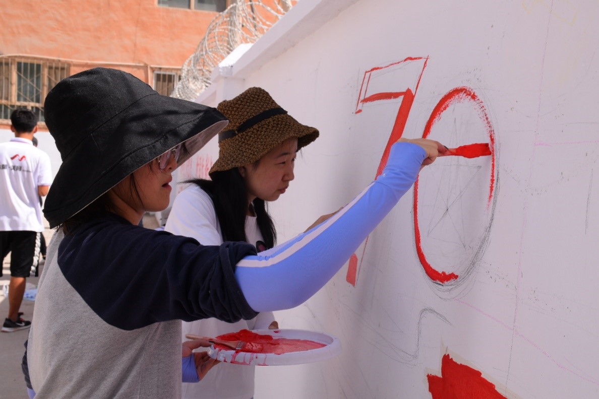 接下来的两天,我司志愿者连同青岛科技大学、山东财经大学以及山东工商学院的志愿者们在莎车县文化路社区绘制文化墙, 在墙上写下这样奋进人心的大字——“壮丽70年,奋斗新时代”;“爱国,励志,求真,力行,奋进新时代,谱写新篇章”;“新时代,新思想,新目标,新征程”,并附有雄伟恢宏的天安门,鲜艳夺目的国旗,庄严肃穆的党徽还有带来和平希望的和平鸽。骄阳似火,志愿者们顶着酷暑,一笔一划认认真真绘制文化墙,社区居民也自发为志愿者们端来一盘盘清脆爽口西瓜、哈密瓜。维吾尔族老乡热情的为志愿者介绍当地习俗,用维语教教一些日常用语,几天的相处,志愿者们已经和社区老乡建立了深厚感情,也和小朋友们打成了一片。