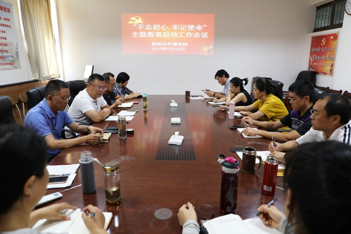 9月19日下午,新闻与传播学院在412会议室召开“不忘初心、牢记使命”主题教育工作会议,对学院开展主题教育工作进行部署。党委书记张银亭主持并作重要讲话,学院马丰刚老师宣读了学院“不忘初心、牢记使命”实施方案。