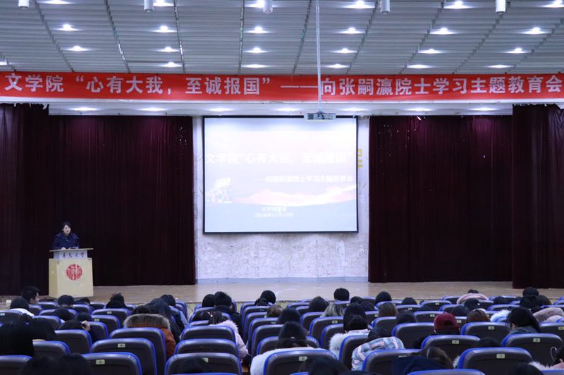 贯彻学校第三次党代会会议精神,文学院开展向张嗣瀛院士学习教育活动——12月13日下午,在金家岭校区图文四楼报告厅举行“心有大我,至诚报国”主题教育会。文学院团委书记曹珺老师主持本次会议,院员工会干部代表和2018级员工共300余人参会。