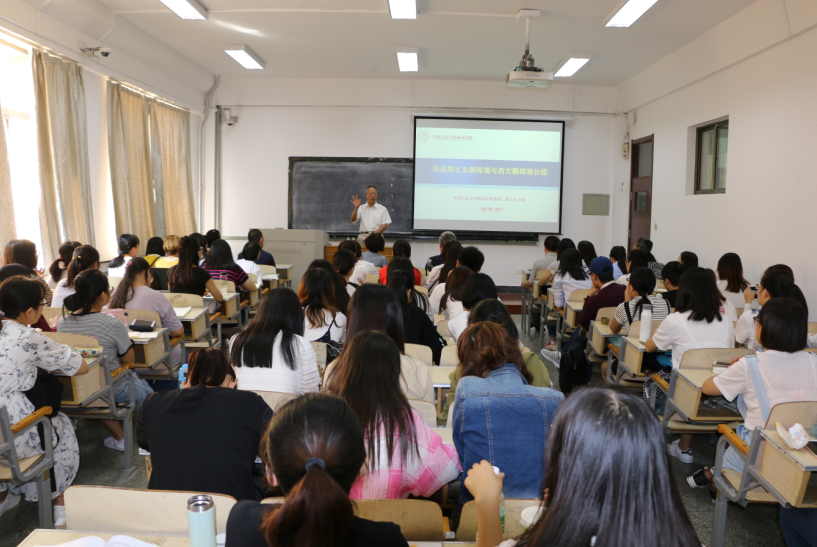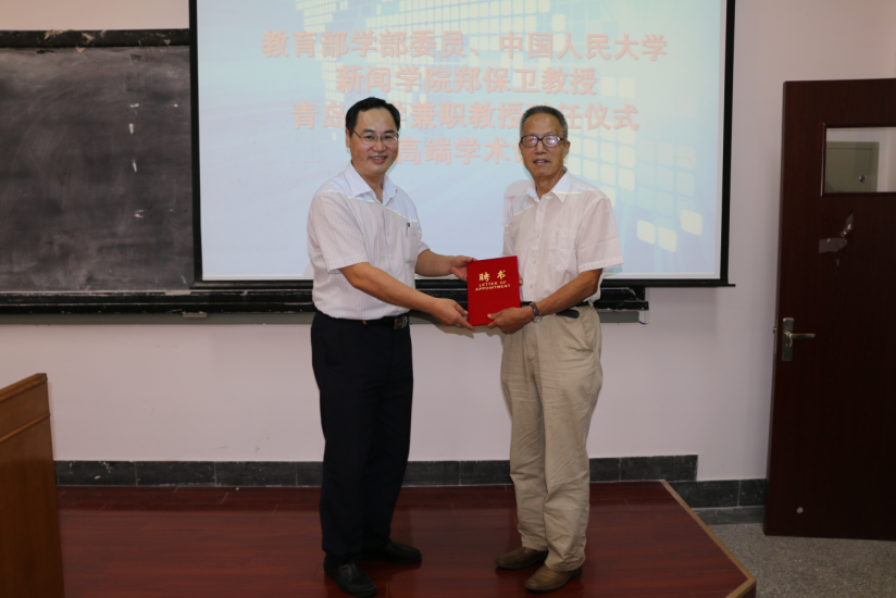 9月11日上午,新闻与传播学院夏季高端学术讲座第六场在博知楼306室举行。教育部学部委员兼新闻传播学科召集人、中国人民大学新闻学院博士生导师郑保卫教授,为师生们作题为《马克思主义新闻观与西方新闻观比较》的学术讲座,并受聘为我司兼职教授。太阳集团党委常委、副董事长李军出席报告会并为郑保卫教授颁发聘书。讲座由新闻与传播学院新闻系副教授赵星耀主持。