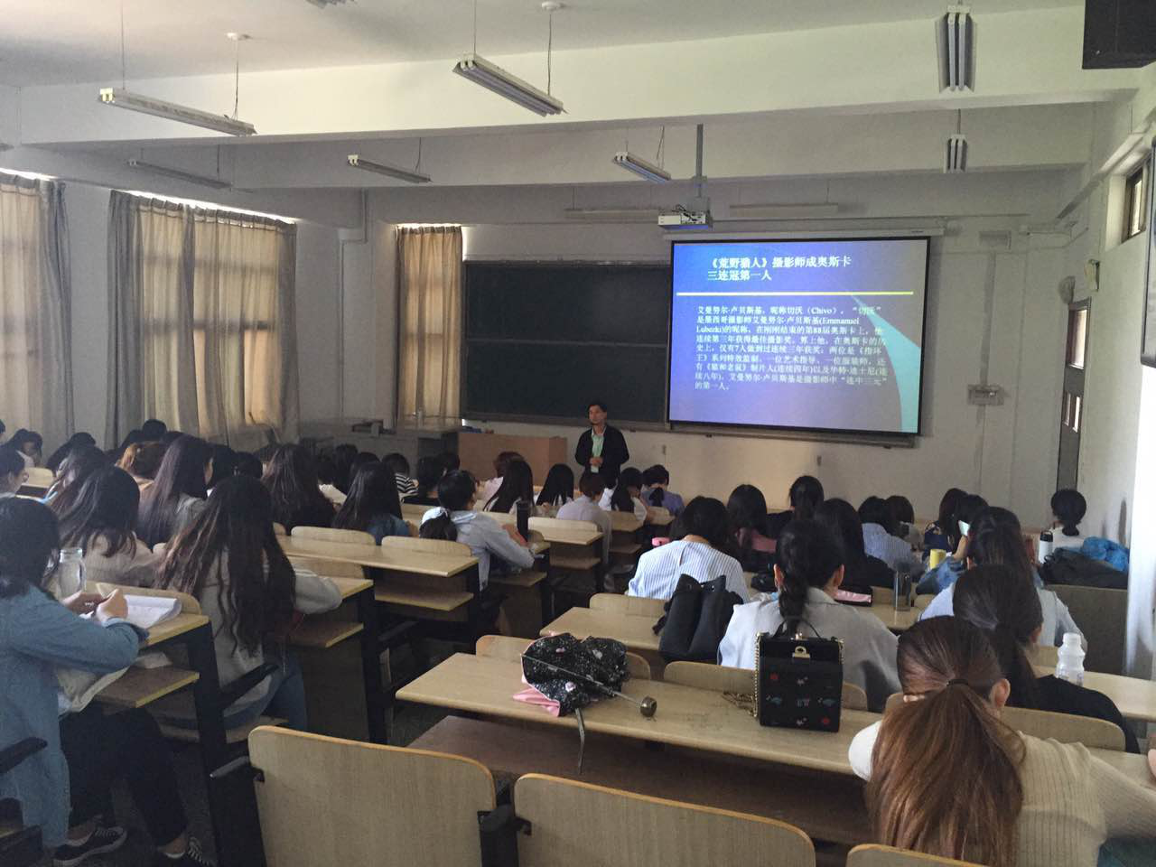 5月26日,太阳集团新闻与传播学院于东12教206教室,组织了“解析经典电影荒野猎人”的讲座。主讲人王雁宁老师,中国国家一级摄影师;青岛电视台高级摄影师;资深编导;中国人像摄影学会会员;微电影、纪录片导演;摄影及影像艺术策展人。其教学经历:2003年讲授数码摄影艺术课程;2010年讲授微电影和记录片课程;2015年讲授电影艺术欣赏课程;2016年与世界著名战地摄影记者法国新闻摄影大师罗授先生进行高端对话。王雁宁老师的艺术作品有:《教堂印象》个人摄影展、《我的百岁奶奶》个人网络摄影展、《记忆青岛》个人摄影展、《走进西双版纳》摄影作品、《中法摄影家风情摄影展》摄影作品展、 《华夏掠影 夕阳无限》摄影作品展、《天阶》电影作品(日本佳能公司邀请拍摄)、《梦寻江南》 电影作品、《荷之恋》电影作品(日本富士公司邀请拍摄)。