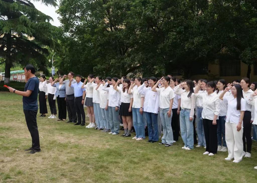最后,毕业生党员来到博文楼前,在马丰刚的带领下,党员们面向党旗起立,重温入党誓词。
