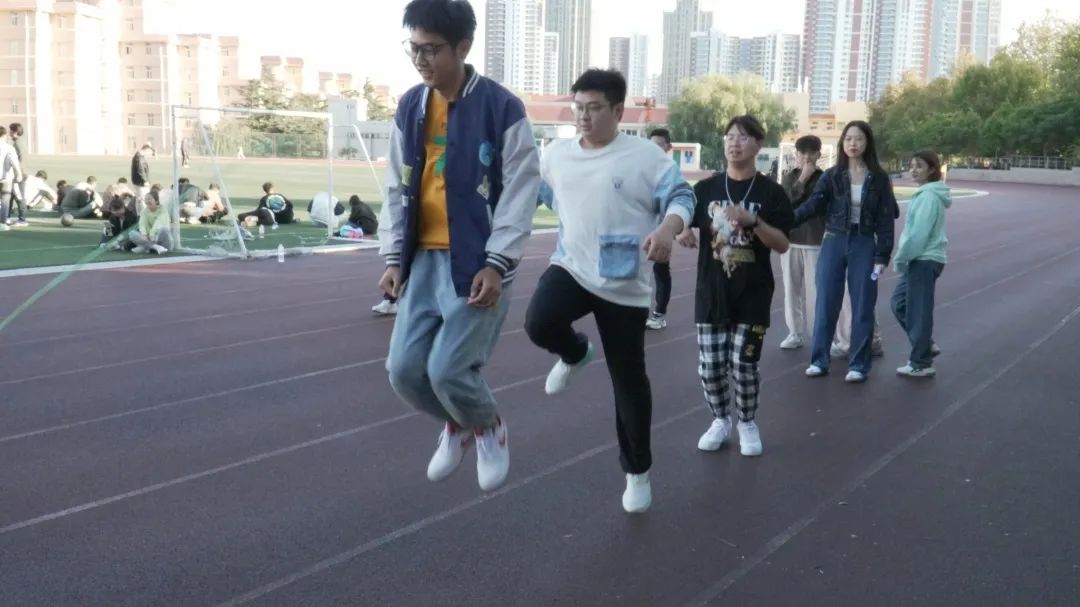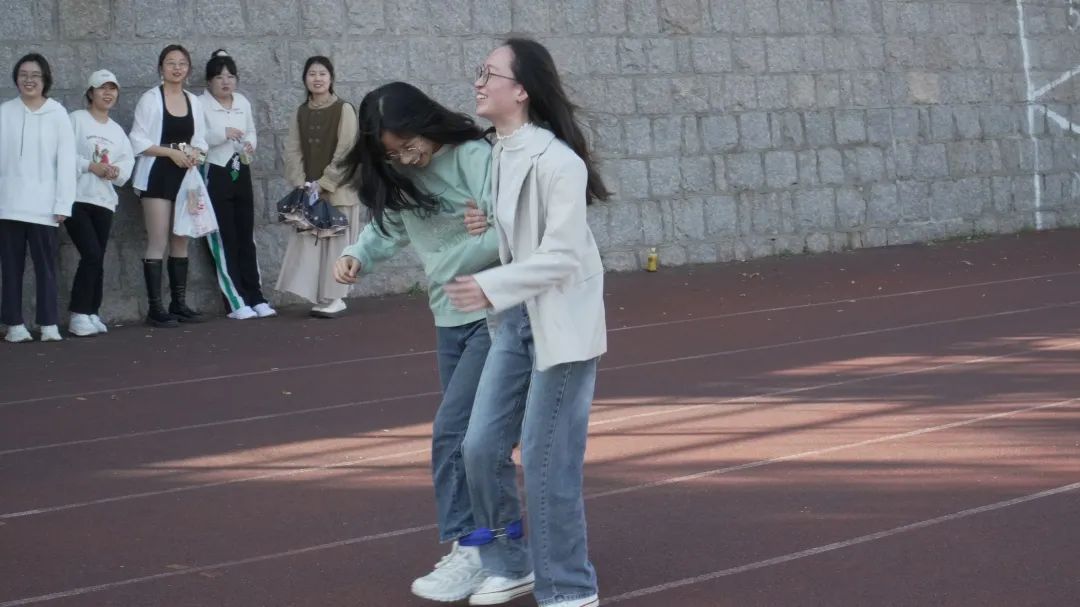 两人三足是第一个运动项目。在这个项目中,同学们需要互相配合,协同前进。他们用绑带将脚绑在一起,嘴里喊着口号步伐一致地向着终点迈进。选手们在赛道上奔跑的样子让人忍俊不禁,也让人感受到了团队合作的力量。